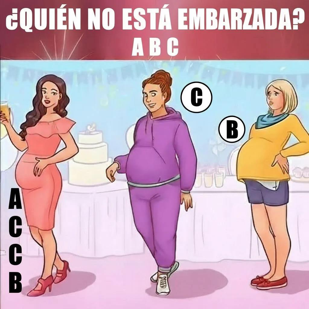 Según la lógica del enigma, es precisamente la mujer B quien no está embarazada. Lo que parece ser un vientre podría, en realidad, ser un objeto escondido bajo la ropa para crear esa impresión.