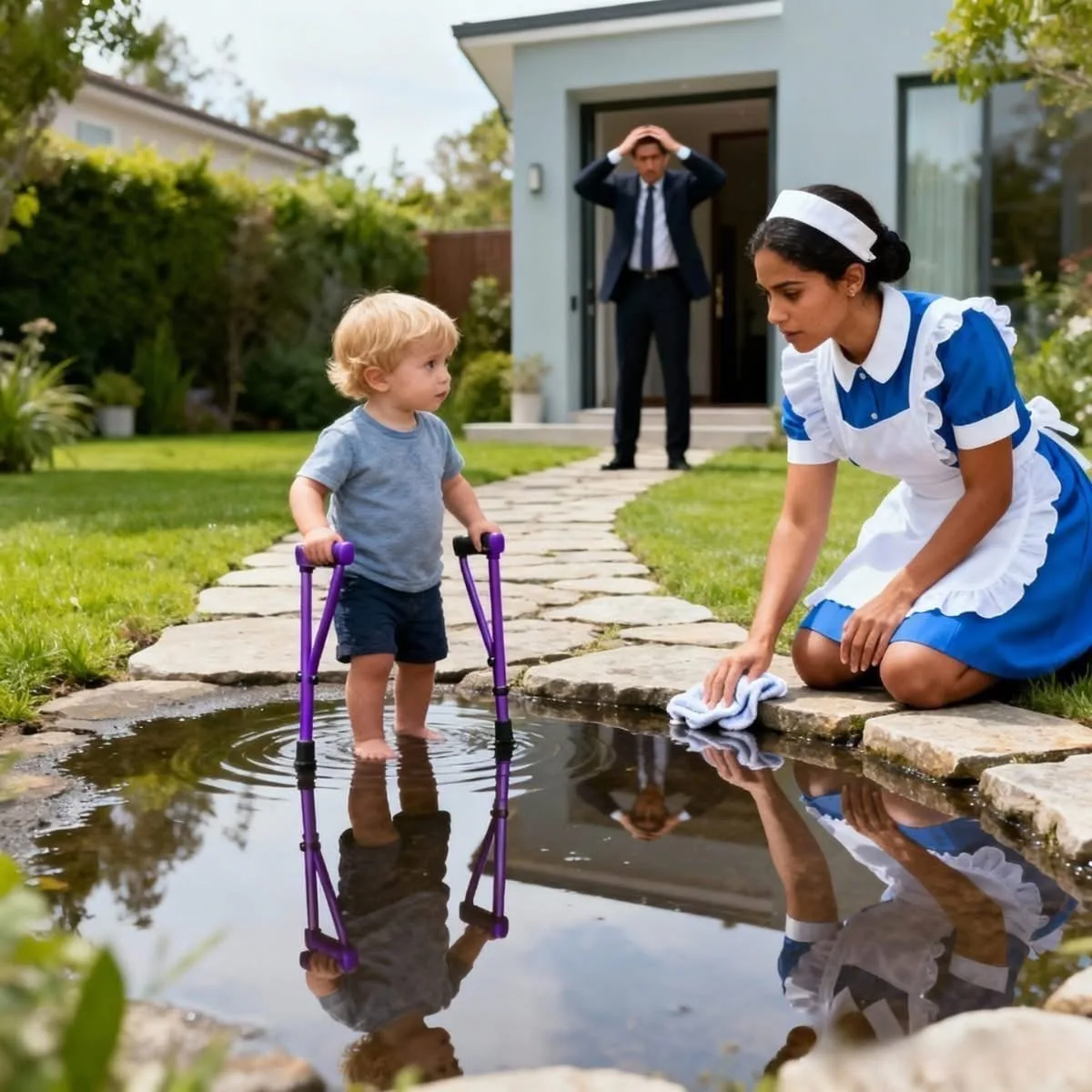 Delante de él estaba Mateo, su hijo de tres años —el mismo que los médicos aseguraron que jamás podría caminar—, de pie, completamente solo, apoyado en unas pequeñas muletas moradas.
