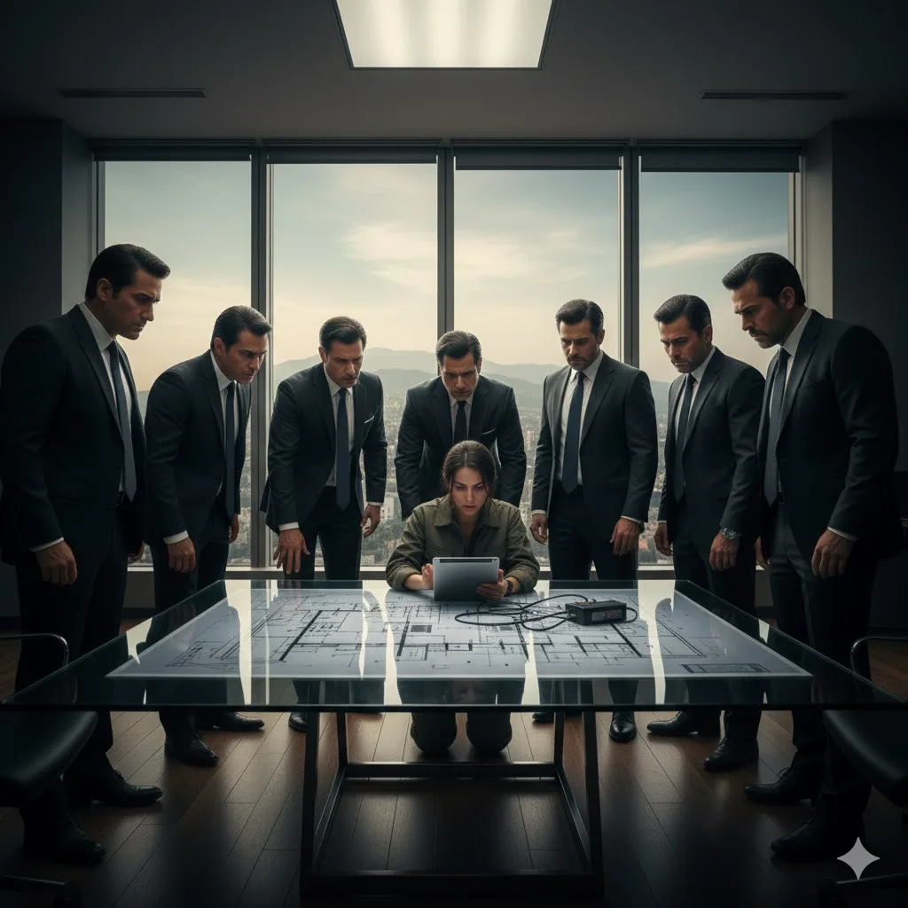 Dentro había una oficina que gritaba dinero: una sala enorme, vistas panorámicas de la ciudad, muebles de madera pulida. Seis hombres con trajes que valían más de lo que yo tendría en toda mi vida rodeaban una caja fuerte tecnológica empotrada en la pared.