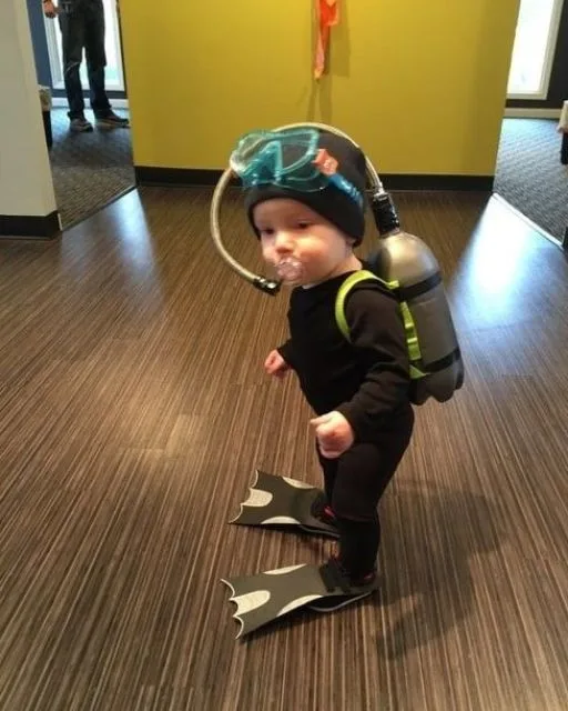 Tiene cinco años. Y estaba vestido de pies a cabeza como un verdadero buzo.