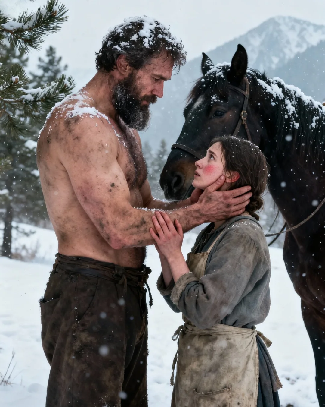 Una figura enorme llenó el umbral: hombros anchos, barba espesa, ojos cansados, manos curtidas. La miró como si la tormenta le hubiera traído un problema, no a una persona.
