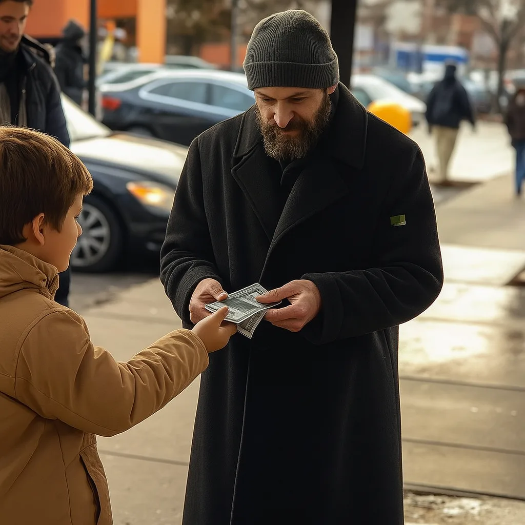 Había un hombre de pie en la acera con dos bolsas — y dentro, había dinero en efectivo. ¡Literalmente estaba repartiendo billetes a los niños que pasaban por allí! Lo más extraño de todo era que el hombre parecía ser un indigente. Llevaba ropa sucia y desgarrada, y su aspecto general era descuidado. Nada tenía sentido.